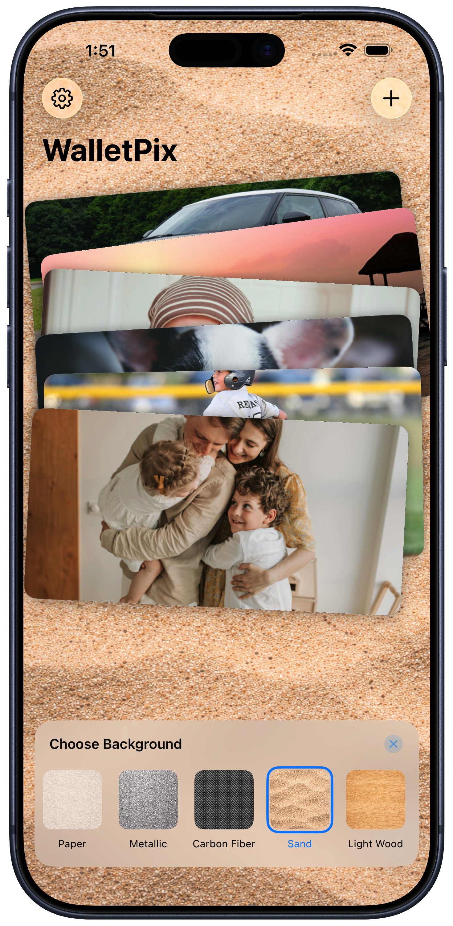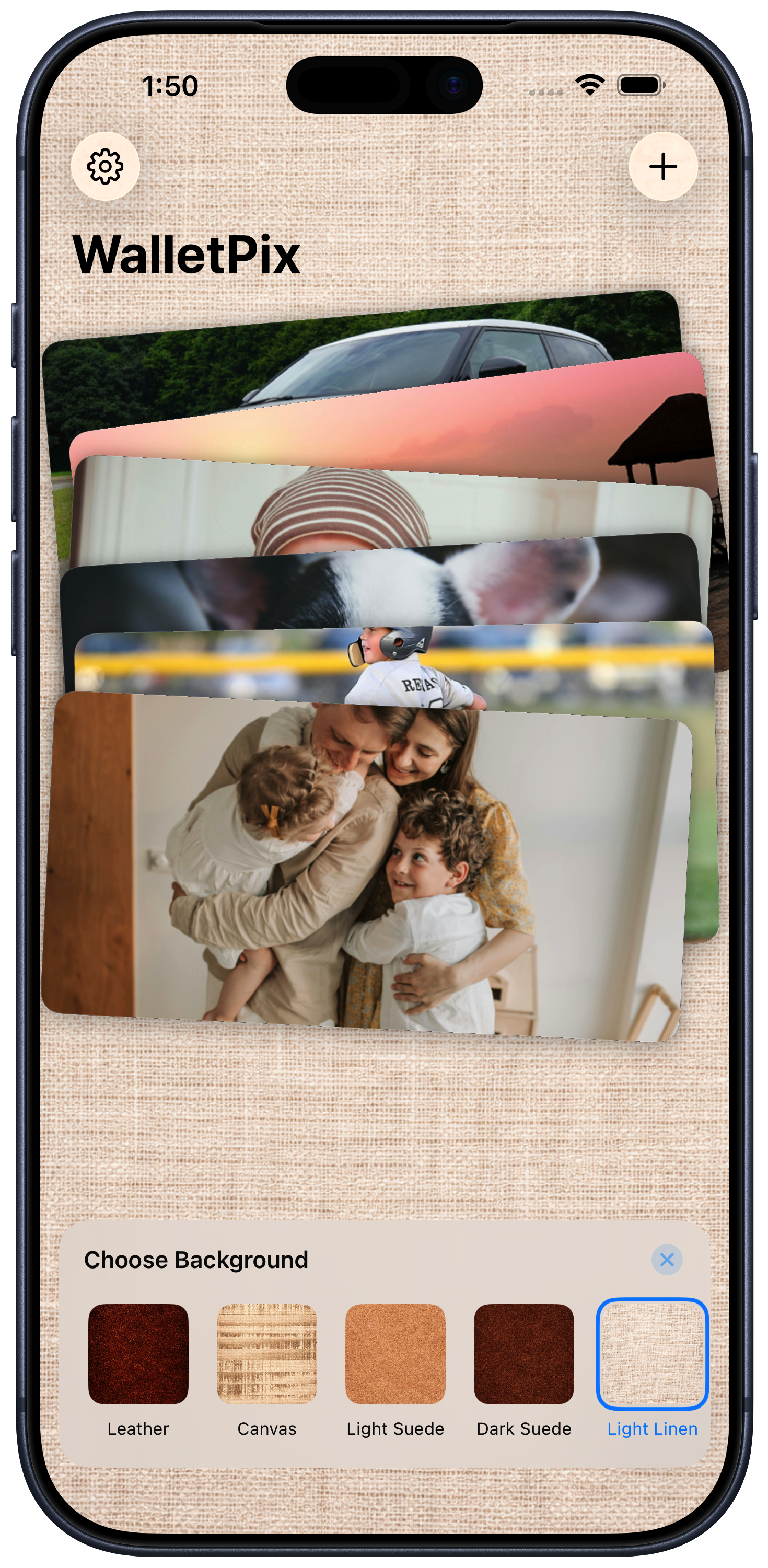 WalletPix lets you personalize the space behind your stack, from rich leather to soft linen tones, so the app feels more like your own pocket photo wallet.